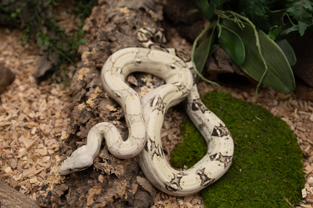 The VPI Snow is a double recessive colour morph which contains Anery type 1 and on the other hand VPI Pink Panther. The colombian T+ variation Pink Panther can also produce some black pigments, due to this, these animals got some really stunning black / grey surrounded saddles on their tail and combined with their dark eyes they are definetely one of our special favorites to work with in the future. The shown animal is an own CB of us.